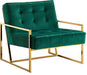 Give your room a touch of elegance and refinement with this ultra modern Pierre green velvet accent chair. The base is made from stainless steel, so it's durably tough and strong enough to withstand heavy daily use. The base is finished in a gold tone hue, adding to its luxurious feel. Tufting on the thick back and seat cushions add to their durability and give it a welcoming look.