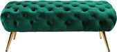 Inject Hollywood glam into your space with this Amara Green Velvet Bench. Its rich velvet upholstery gives it a sleek, modern look while stainless steel legs with a gold finish add to its lavish appearance. This bench has a wide seat with a plump cushion that cradles your body in comfort while you unwind and relax. The button-tufted top keeps the material inside from shifting, so it stays aloft and ready to comfort you as you sit.
