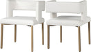 Add the Caleb white faux leather dining chair to your dining room for the ultimate in comfort and style. This chair has a square seat and low back which is open at the bottom to the rear and on the sides. Four brushed gold square iron legs provide support and stability, while the chair's soft velvet and cushioning offer an air of luxury. Several available tables make a perfect companion to this contemporary piece.