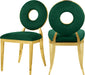Yield to the decorator within when you bring home this Carousel velvet dining chair. This chair features a metal frame and legs finished in gold stainless steel for a modern touch, but the real star of the show is the donut-shaped seat back that exudes undeniable contemporary charm. The seat and back are both plumply filled for comfort and upholstered in soft green velvet for a chic look.