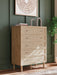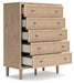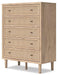 Clean-lined and contemporary—but far from stark—this chest of drawers is a fresh style awakening. Pairing a light finish with replicated oak grain and textured beige details that replicate the look of cane, its mixed materials bring a naturally versatile vibe to your bedroom. Sleek, simple hardware plays perfectly with the modern aesthetic. Prepare to have your mind blown by the vast universe of possibilities that await within the spacious drawers.