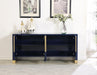 Make a bold statement in your living space with this eye-catching Florence Sideboard/Buffet from Meridian Furniture. Its deep navy blue lacquer is complemented by a gold finished base, creating a contemporary design that's both modern and stylish. Four side cabinet doors open up to reveal four cubby spaces, giving you ample room to safely tuck away dishes, pots and pans, knick-knacks, books, or other household items, while the top of the sideboard/buffet doubles as shelf space for items you want on display.