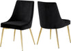Extend contemporary panache to the dining room with this Karina Black Velvet Dining Chair. This dining chair features upholstery in sleek black velvet for a modern look and has an armless design for a retro-inspired vibe. The stark black color makes it easy to blend in with your existing decor colors or make a contrasting statement with ease. The slanted legs of this chair are gold finished for added modernity and to provide reliable and durable support while you dine.