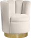 Spruce up your home with this elegant Lily Cream Velvet Accent Chair from Meridian Furniture. Its curved design and soft cream velvet upholstery give it a sophisticated appeal that complements your existing contemporary decor and home furnishing. A gold steel swivel base provides solid support, as well as freedom to turn and face whichever direction you choose while you curl up with a beloved book or in front of your favorite TV show.