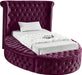 Marvel at the remarkable beauty and graceful lines of this round Luxus purple velvet twin size bed. The headboard, footboard and side rails are all adorned with deep button tufting, and there is nailhead trim on both sides of the tall headboard. The footboard and side rails all contain ample storage and seating, making it easy to sit down in comfort so you can put on your pants or shoes.