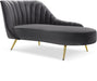 Lean back and lounge in luxurious style on this stunning Margo velvet chaise by Meridian Furniture. This contemporary chaise features plush velvet upholstery that is both classy and sumptuous against your skin, a single seat cushion and rounded arms that curve into a low, rounded back, creating a perfect, modern piece for your home. Gold stainless steel legs support this chaise and provide stunning contrast to the chaise's plush, grey fabric.
