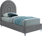 There���s a lot to fall in love with when it comes to this Rainbow twin-size velvet bed. This stunning bed is fit for an MVP with its rich grey velvet upholstery covering the headboard, side rails and foot board. This bed rests on thick white acrylic legs for added support and features deep channeled tufting on the headboard for a textural look that���s dramatic and elegant all at once.