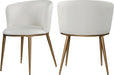 Enhance your d?�cor with the Skylar white faux leather dining chair, due to its petite silhouette and artistic style. A soft round cushion and gently curving cushioned back give this chair an ageless quality that belies its contemporary design. A brushed gold base is supported by four tapering gold legs, and it weighs only 11 pounds overall. Easily paired with any of several available tables, this chair is equally well-suited to use in a conversation grouping.