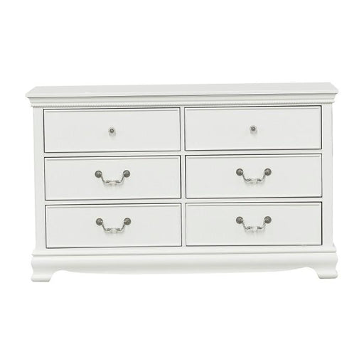 Lucida Collection by Homelegance White finiish Made of manmade wood Bead molding Shell motif 6 Drawers Dovetail drawers Metal on metal center glid...