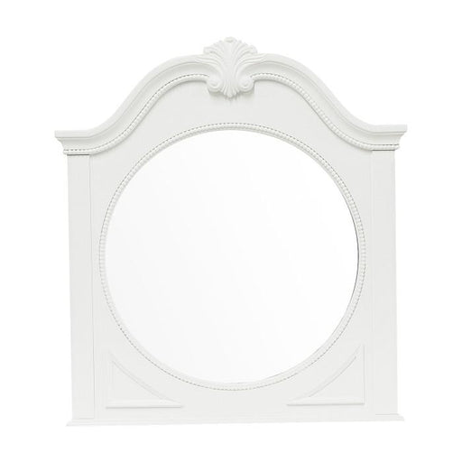 Lucida Collection by Homelegance White finish Made of manmade wood Bead molding Shell motif Curved style Round inner mirror