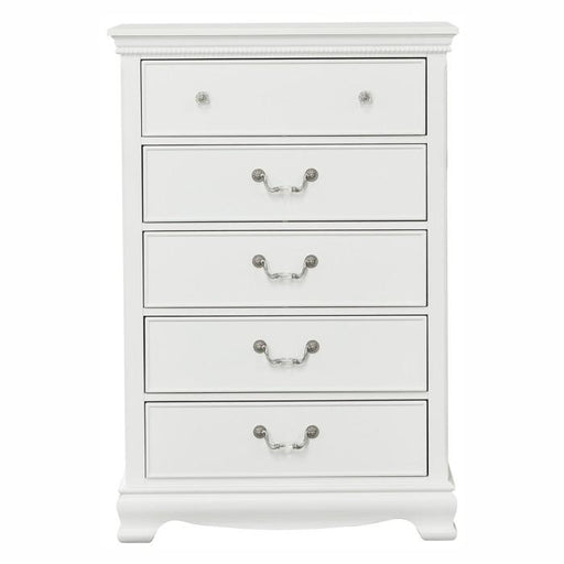 Lucida Collection by Homelegance White finish Made of manmade wood Bead molding Shell motif 5 Drawers Dovetail drawers Metal on metal center glide...