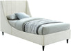 Snuggle up to a pet or other loved one in this richly upholstered Eva cream velvet twin size bed for the ultimate in rest and relaxation. The wing back headboard has cushioned vertical deep channel tufting, and both the side rails and footboard are upholstered too for your comfort. Tapered black wood legs match the upholstery and support this contemporary bed, elevating it sufficiently that you can store items underneath.