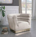 Add a bit of pizzazz to your living space with this Bellini Cream Velvet Chair from Meridian Furniture. Rich cream velvet upholstery offers you a luxurious place to curl up with a good book or rest in front of the TV after a long day, while horizontal channel tufting creates texture and style. Its gold stainless steel base provides solid support, while adding to the chair���s contemporary appearance. Its uniquely curved shape makes this piece a perfect addition to any room in your modern home.