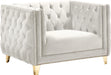 Upholstered in soft cream velvet, this Michelle chair is sumptuously glamorous. Designed for upscale living, this chair features rich gold nail head trim and gold iron legs that keep it grounded in contemporary beauty. Tufted material covers every inch of this unit, and button tufting ensures that the unit stays plump and comfortable and holds up well to continual use. Pair it with other items in the collection for a cohesive look.
