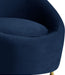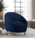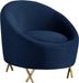 Give your living space a bold touch with this Serpentine navy velvet chair. This roomy chair features lush navy velvet upholstery that offers a soft, comfy place to rest that is pleasing to your senses, while its rounded, contemporary design mixes style and comfort. Gold steel legs complement the chair's navy color, giving it an elegant touch that?��Ǩ�Ѣs perfect for your chic home decor. Place this chair in a corner or next to an end table for additional seating options in your living room or den.