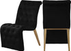 Usher in a new era in your dining room with this Curve velvet dining chair to impress your guests. This chair features an elongated front that sweeps the floor for a look that���s luxe to the max. Soft black velvet feels sleek and rich to the touch, giving it a refined and elegant feel. Its rich gold iron legs and detailed button tufting ensure that this chair takes on a decidedly modern vibe.