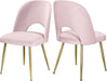 Sit for hours on the Logan pink velvet dining chair, no matter what may be the task at hand. Both the back and seat are both well-cushioned with foam, and the back has a semicircular cutout in the lumbar area for your comfort. The chair has a wooden frame, and is supported by four brushed gold legs, with decorative balls for feet. Contemporary in style, this chair goes well with any table or d?�cor scheme.