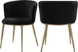 Enhance your d?�cor with the Skylar black velvet dining chair, due to its petite silhouette and artistic style. A soft round cushion and gently curving cushioned back give this chair an ageless quality that belies its contemporary design. A brushed gold base is supported by four tapering gold legs, and it weighs only 11 pounds overall. Easily paired with any of several available tables, this chair is equally well-suited to use in a conversation grouping.