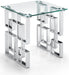 Enjoy a contemporary look in your living room or den with this stylishly elegant Alexis chrome end table. This Meridian Furniture table is made from glass and metal for a sleek, modish look. The base features a geometric design with intertwined squares that form two pedestals. The top is crafted from thick, clear glass that allows the beauty of the base to shine through completely. A chromed finish shores up the design, adding to its up-to-the-minute feel.