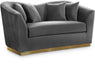 Make the Arabella Grey Velvet loveseat your favorite naptime spot. This handsome loveseat is upholstered in grey velvet for a glamorous touch and is accented with gold stainless steel around its base for a touch of modernity. Its curvy back gives it a graceful look in your living room or den, and it comes with coordinating throw pillows that beckon you to sit down and rest (or nap) for a spell.