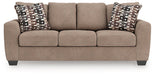 Transitional and right on trend. This sofa’s upholstery is a delightful change from the ordinary, with hints of soft brown giving the gray hue added depth. It’s punctuated with chic accent pillows in an eye-catching, stylized stripe design. Whether you're hosting friends and family or relaxing solo, this sofa invites homey, comfortable character into your space.