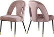 Modern and traditional elements collide in the design of this Akoya Pink Velvet Dining Chair. Velvet upholstery covers the back and seat, giving it a decidedly glamorous look while two strategic cutouts provide just a hint of bold, modish fun. The gold nailhead trim on the back adds an edgy vibe, and metal legs in a black finish with goldtone tips rounds out the dining chair providing sturdy support and a contemporary look.