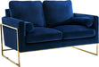 Seat guests in complete luxury on the Mila Navy Velvet Loveseat. The bold navy color makes a statement in your space, and the gold stainless steel frame ensures sturdy support while you relax or take a nap. It comes with two throw pillows that cradle your sides as you sit, elevating its comfort level. Lots of clearance beneath this sofa makes cleaning and vacuuming a breeze. Buy it alone or pair it with the matching sofa or chair!