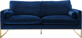 Seat guests in complete luxury on the Mila Navy Velvet Sofa. The bold navy color makes a statement in your space, and the gold stainless steel frame ensures sturdy support while you relax or take a nap. It comes with two throw pillows that cradle your sides as you sit, elevating its comfort level. Lots of clearance beneath this sofa makes cleaning and vacuuming a breeze. Buy it alone or pair it with the matching loveseat or chair!