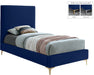 Provide yourself with a few options when you choose the sleek Geri navy velvet twin size bed. The headboard, side rails and footboard are all cushioned and upholstered, with snazzy decorative piping on the headboard and footboard. This bed comes with two different sets of legs so you can match your other d?�cor. Use the gold ones, the chrome ones, or two of each color for a truly contemporary approach.
