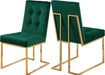 Elevate your dining experience with this Pierre green velvet dining chair. A boxy geometric shape makes this chair an uber modern addition to your space, while a base of stainless steel makes it durable and tough, so it holds up to heavy daily use. The gold tone finish on the base contrasts nicely with the green velvet upholstery used on the seat and back. Heavy tufting adds to the rich appeal of this beautiful design.