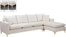 Bring glamour to your living room or den with this Naomi cream Velvet Sectional. This striking set blends the modern with the traditional for a look that wows from every angle. Luscious velvet provides a neutral element to your room, ensuring its easy fit with existing furnishings. Choose from either set of legs, both gold and chrome, to customize the sectional to your specific tastes. Pillows come with this sectional, adding to its welcoming feel.