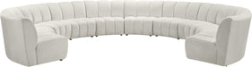 Create a seating group that works for every possible situation with this Infinity 10-piece sectional and other pieces in the Infinity collection. Upholstered in soft cream velvet material that feels great against the skin and offers long-wearing beauty, this piece fits with other Infinity items for an infinite number of combinations that get your seating requirements just right but that look just as nice when used on their own.