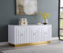 Give your dining room space a bold new look with this Cosmopolitan sideboard buffet. An amazing amount of storage space for china, dishes, serving pieces, and other essentials is only half the story with the Cosmopolitan. This white lacquer-finished sideboard features acrylic and gold hardware and a gold stainless steel base for a look that���s oozing contemporary panache from every angle. Use the top for a makeshift dessert bar after dinner.