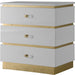 Go for an upscale, regal look in your room with this Esme Side Table. A sleek white lacquer finish adds a distinctive modern touch, and gold-finished trim on the painted wood base lends sophistication, style, and elegance to this handsome table. Three drawers offer roomy interiors for storing everything from bedside essentials to reading material, and a large top is sufficiently sized to accommodate a lamp, alarm clock, and other items. Use this Esme Side Table as a nightstand in the bedroom, or ring it into the living room as an end table for needed storage.