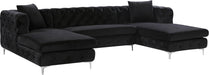 Bring fine living to the forefront with this Gail three-piece sectional. This black-colored sectional features two chaise ends, giving you the room you need to snuggle up and get comfortable on movie night. The upholstery is made from velvet and simply luxurious to the touch. Deep tufting all over the backs and sides of this unit add to its glamorous vibe, while the chromed legs finish off the design on a modern note. This sectional comes with pillows for added comfort and style.