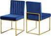 Take dining to a posh new level with this Giselle Navy Velvet Dining Chair. A boxy design makes it a nice addition to contemporary spaces, and it's armless design makes it easy to get into and out of with ease. The seat and back are upholstered in rich navy velvet for a lavish vibe and a pop of sumptuous color to liven up your room, and both are padded well to make sure diners stay comfy while they enjoy their meal. The metal frame is finished in gold for added beauty and aesthetic appeal.