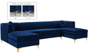 Sit back and get comfy on this navy velvet Graham three-piece sectional sofa. Plush navy velvet with a channel tufted back creates a contemporary display that is sure to be the focal point of your living room. This double chaise sectional features an inner width of 25 inches and outer width of 32 inches, with a width of 67 inches between both chaises, offering ample space for you and your loved ones to cuddle up and watch a movie after a long day. This sectional comes with complete sets of gold and chrome legs, so you can customize it to suit your existing decor.