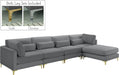 Ready to get cozy? Curl up from the welcoming confines of this Julia velvet modular sectional and you can do just that! Its soft grey velvet upholstery is soft and supple to the skin, coaxing you to relax, unwind, and sit for a spell. It comes with both gold and chrome legs for a customizable and contemporary finish. Pair this Julia piece with others to form an infinite number of seating configurations to meet your particular decorative desires and space requirements.