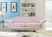 Set your sights on elegance with this Clarissa Pink Velvet Sofa. This stunning sofa features plush velvet upholstery that's soft and supple to the touch, adding a level of luxury to naptime or making for a lavish evening of TV binge-watching. This svelte sofa has a contemporary design with rolled arms and elegant slanted legs made from stainless steel with a goldtone finish. Buy it on its own, or add it to your living room or den with the available loveseat and chair.