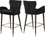 Inject beautiful color into your counter or home bar area with the Luxe Black Velvet Stool. Flared sides and a semi-high back provide support while you sit, so you stay comfortable for the whole meal. Channel tufting on the seat and back adds a dimensional effect while helping the padded cushions keep their loft and form. The metal legs are given a black finish for a contemporary look and goldtone hardware tips for a regal finish.