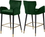 Inject beautiful color into your counter or home bar area with the Luxe Green Velvet Stool. Flared sides and a semi-high back provide support while you sit, so you stay comfortable for the whole meal. Channel tufting on the seat and back adds a dimensional effect while helping the padded cushions keep their loft and form. The metal legs are given a black finish for a contemporary look and goldtone hardware tips for a regal finish.