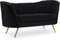 Lean back and lounge in luxurious style on this stunning Margo black velvet loveseat by Meridian Furniture. This contemporary loveseat features plush velvet upholstery that is both classy and sumptuous against your skin, a single seat cushion and rounded arms that curve into a low, rounded back, creating a perfect, modern piece for your home. Gold stainless steel legs support this loveseat and provide stunning contrast to the loveseat's plush, black fabric.