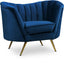 Lean back and lounge in luxurious style on this stunning Margo navy velvet chair by Meridian Furniture. This contemporary loveseat features plush velvet upholstery that is both classy and sumptuous against your skin, and rounded arms that curve into a low, rounded back, creating a perfect, modern piece for your home. Gold stainless steel legs support this chair and provide stunning contrast to the chair's plush, navy fabric.