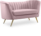 Lean back and lounge in luxurious style on this stunning Margo pink velvet loveseat by Meridian Furniture. This contemporary loveseat features plush velvet upholstery that is both classy and sumptuous against your skin, a single seat cushion and rounded arms that curve into a low, rounded back, creating a perfect, modern piece for your home. Gold stainless steel legs support this loveseat and provide stunning contrast to the loveseat's plush, pink fabric.