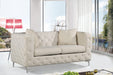 Sink into the welcoming comfort of this Scarlett cream velvet loveseat. This loveseat defines elegance and sophistication with its boxy retro look and its deeply tufted upholstery that covers every inch of the sides, back, and front. The cream velvet material feels luxurious to the touch while the chromed legs lend the loveseat sturdy support and a modish finish. Pair it with other items in the Scarlett collection for a complete look.
