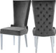 Draw the attention of anyone who steps foot in your living space with this Serafina Grey Velvet Dining Chair from Meridian Furniture. Its luxurious grey velvet upholstery is both soft and elegant, adding a chic touch to your home. Its high back with a deep button tufted design gives this stylish chair a regal appearance, while rich chrome metal legs complement its grey color while providing sturdy support to the chair's frame.
