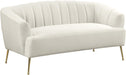 Dress up your living room space with this Tori Velvet Loveseat. This plush loveseat features chic cream velvet upholstery that covers every square inch, adding a sumptuous and svelte look to your room. The gold legs with a ball design on the foot adds to the elegant look of this pretty chair, and deep channel tufting adds loft to the back and arms for a lavish feel when you sit down to relax and unwind at day���s end.