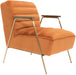 Go mod in your living room, den or other space with this Woodford velvet accent chair. This lovely addition to your home features soft orange velvet upholstery for a lavish look in any room. The back and seat are channel tufted for added resilience and lasting beauty. The metal frame adds enduring quality to this chair, and the brushed gold metal legs and wood arms lend it a definitive contemporary vibe.