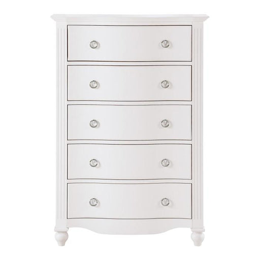 Homelegance (Homerica East)Original price $1,232.50Current price $948.08| /Meghan Collection by Homelegance White finish 5 Drawers Made of manmade wood and wood Dovetail drawers Ball bearing glides Polished chrome tone ri...