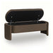 There’s more to this upholstered storage bench than what meets the eye. Its soft heathered brown upholstery provides a comfy sitting area. Lift the hinged seat to reveal lots of storage for pillows, blankets or other essentials. Coupled with its unique capsule shape, this bench is full of form and function.